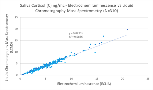 Below is an example of true clinical patient samples run via liquid chromatography mass spectrometry (LCMS) and electrochemiluminescence (ECLIA). While the correlation is incredibly strong, mass spectrometry produces slightly lower results due to a true elimination of interferences that register as a hormone signal with many immunoassays. ZRT’s LCMS cortisol range is slightly lower than the electrochemiluminescence range by about 15%.