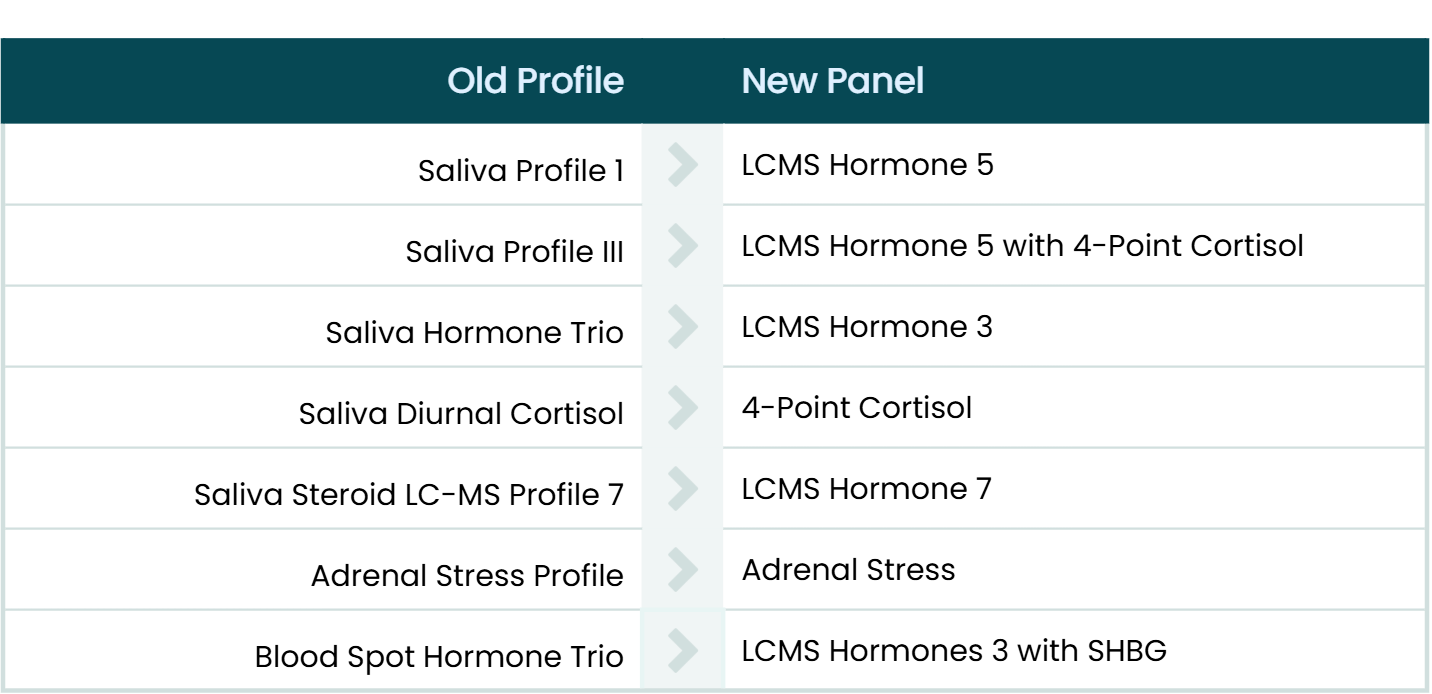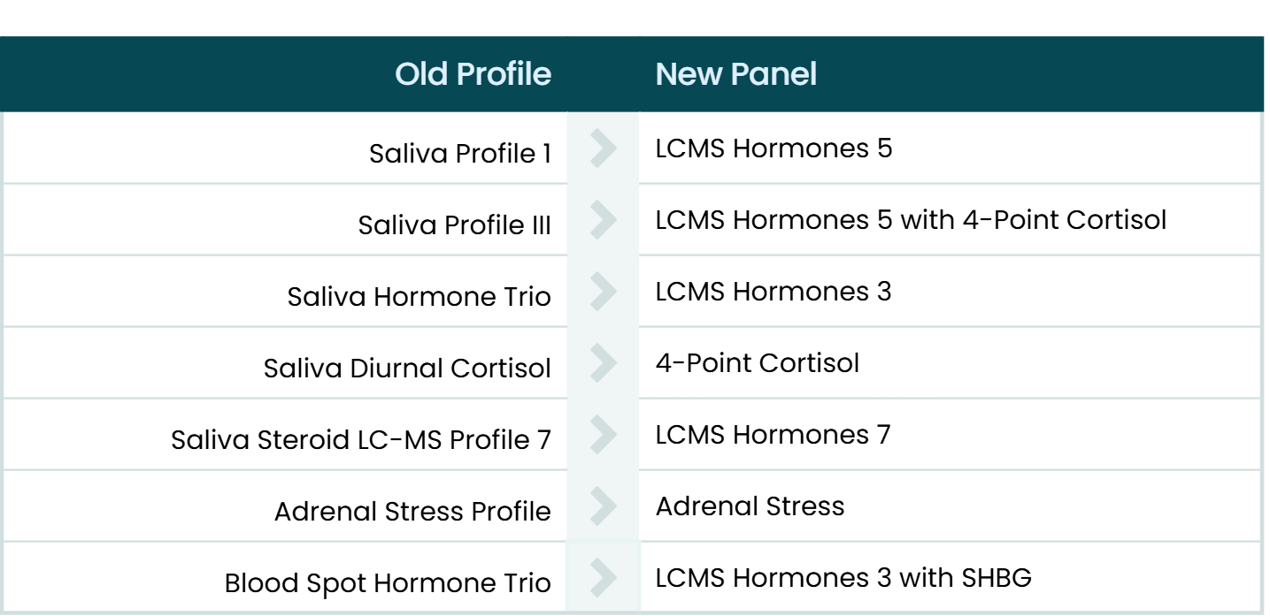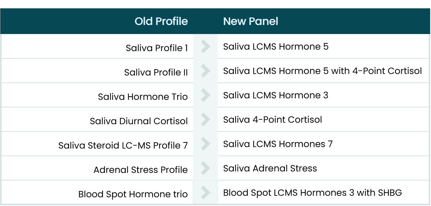 If you need help matching old profiles to our new panels, take a look at the Panel Transition Guide. You can find a full list of new and updated profiles in the Overview of Kits, and all analytes with their assay types in the Directory of Tests.